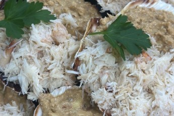 Presented on a scallop shell with white and brown crab meat