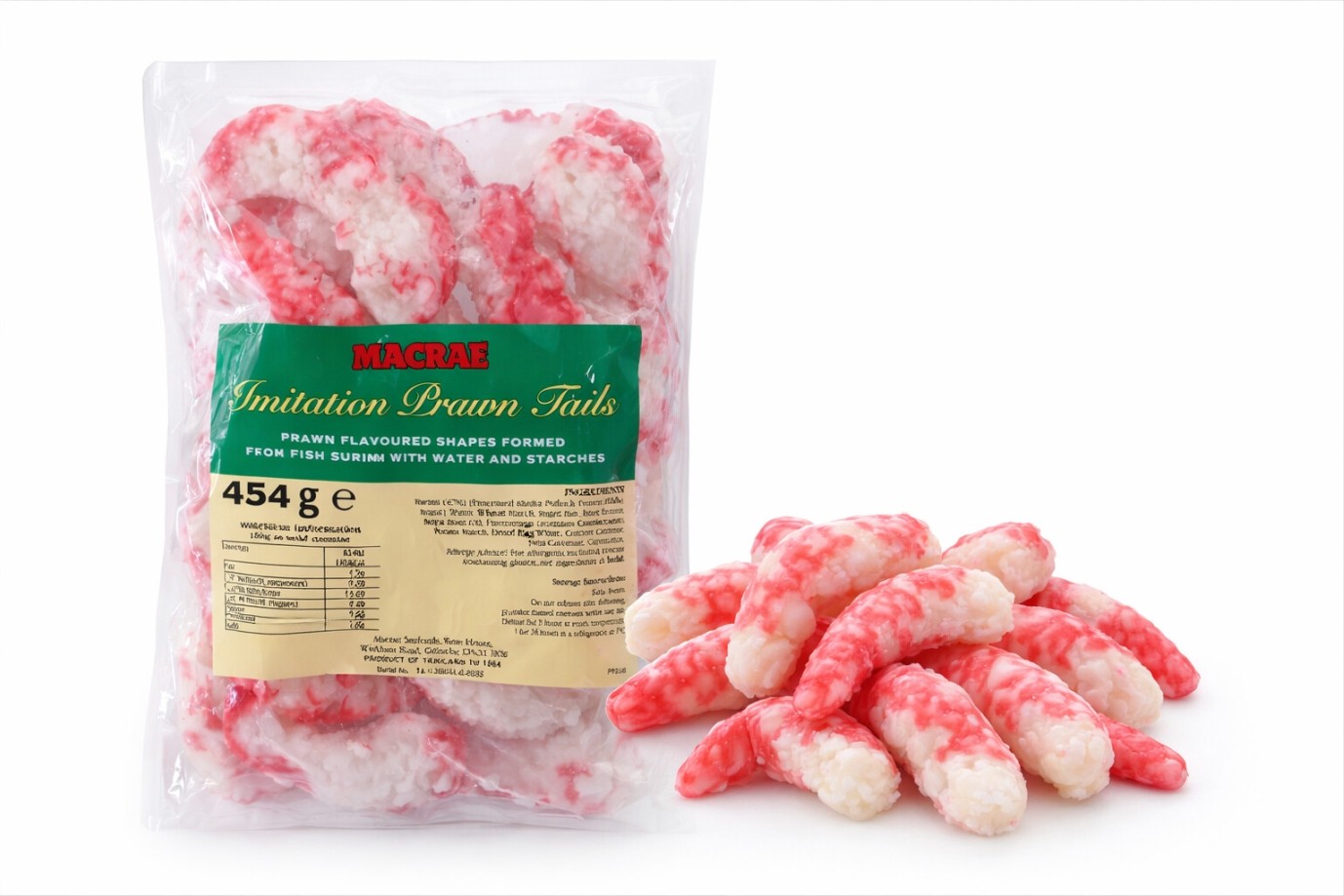 These are actually Surimi, the same as 'Crab Sticks', but prepared to look like prawns. There are around 20 individual pinks in a bag