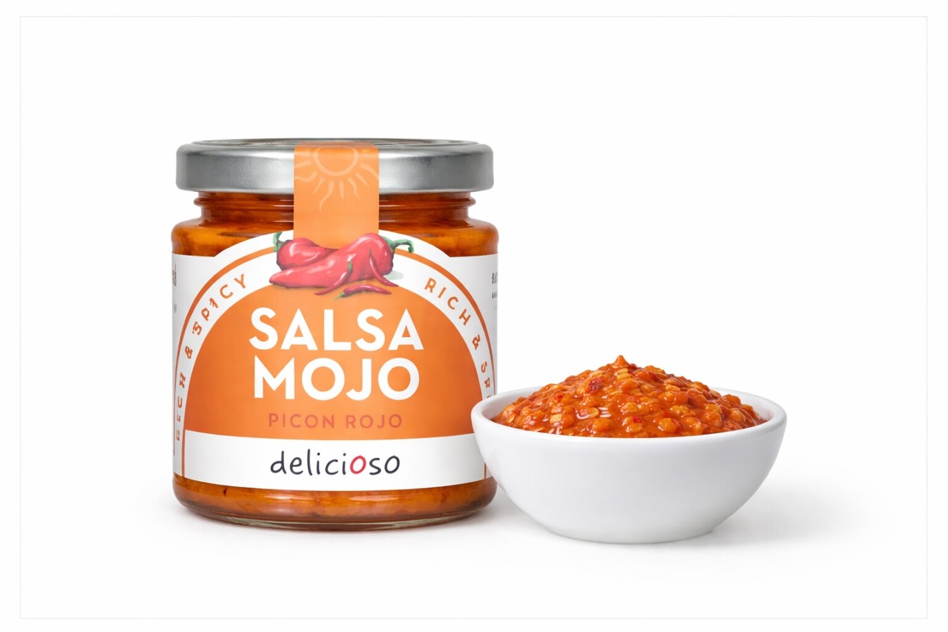 Piquillo peppers, extra virgin olive oil, water, purple garlic (purple garlic, salt, citric acid), sherry vinegar, sugar, salt, cornflour, hot Spanish paprika, red chillies, cumin, and emulsifier: xanthan gum